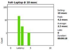A differenza della stragrande maggioranza dei protocolli di trasmissione esistenti, nel protocollo Dante® la latenza di trasmissione è sempre dell’ordine di pochi millisecondi (in questo pc laptop da controllo palco, ad esempio, la media misurata - l'average - è di 2,3 millisecondi, tempo inferiore alla capacità umana di percepire un ritardo nel lip-sync).